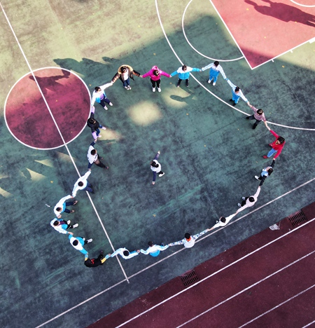 11月9日,在貴州省遵義市鳳岡縣特殊教育學(xué)校,老師帶領(lǐng)學(xué)生們在操場做游戲。視覺中國供圖