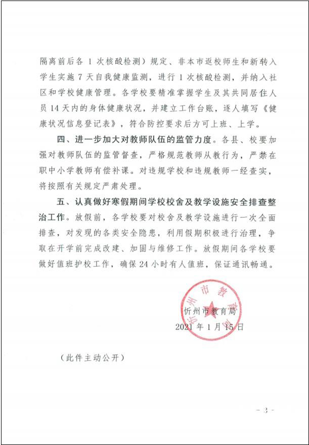根據(jù)省、市疫情防控工作領(lǐng)導(dǎo)小組及省教育廳視頻會議精神和我市新冠疫情防控最新形勢,為保障全市師生生命安全和身體健康;經(jīng)市委、市政府同意,現(xiàn)將2021年寒假及假期前后工作安排如下,請遵照執(zhí)行。
