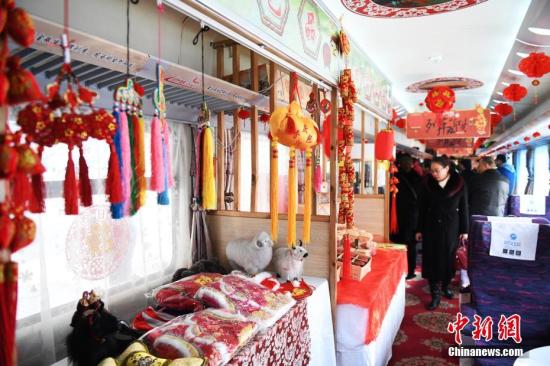 1月13日,春運(yùn)首日,蘭州鐵路局蘭州客運(yùn)段擔(dān)當(dāng)?shù)腪6207次列車上設(shè)立“年貨超市”吸引旅客。中新社記者 楊艷敏 攝