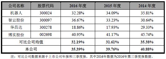 2014年至2016年,同行業(yè)上市公司綜合毛利率均值分別為35.38%、31.61%、32.19%。克來(lái)機(jī)電綜合毛利率高于可比公司均值。