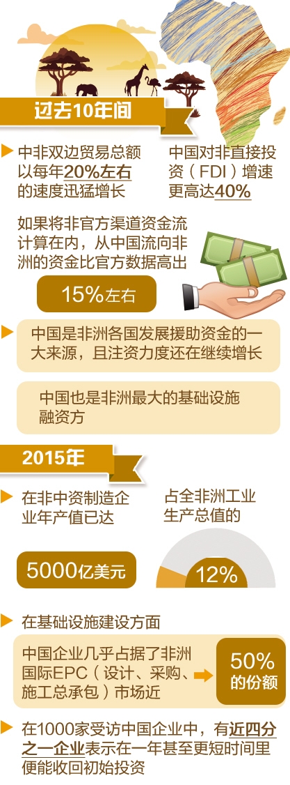 從經(jīng)營領(lǐng)域上看,調(diào)查顯示,中國企業(yè)在非洲的經(jīng)營領(lǐng)域十分廣泛,除制造業(yè)外,服務(wù)業(yè)企業(yè)占比達四分之一,貿(mào)易企業(yè)與建筑及房地產(chǎn)企業(yè)占比各為五分之一。2015年,在非中資制造企業(yè)年產(chǎn)值已達5000億美元,占全非洲工業(yè)生產(chǎn)總值的12%。在基礎(chǔ)設(shè)施建設(shè)方面,中國企業(yè)的主導(dǎo)地位更為明顯——幾乎占據(jù)了非洲國際EPC(設(shè)計、采購、施工總承包)市場近50%的份額。中國企業(yè)的盈利也相當可觀,在1000家受訪企業(yè)中,有近四分之一企業(yè)表示在一年甚至更短時間里便能收回初始投資,三分之一的企業(yè)利潤率超過20%。而且,這些企業(yè)的市場觸覺極其敏銳,能夠迅速適應(yīng)新環(huán)境、響應(yīng)新機遇。這些企業(yè)主要側(cè)重滿足非洲日益增長的市場需求,而非出口業(yè)務(wù)。許多中國企業(yè)已在非洲開展了長期投資,有74%的受訪中資企業(yè)對未來發(fā)展前景抱有樂觀態(tài)度。