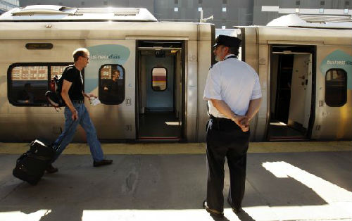 在美國波士頓市的一個火車站,乘客準(zhǔn)備登上Acela列車。(新華社)
