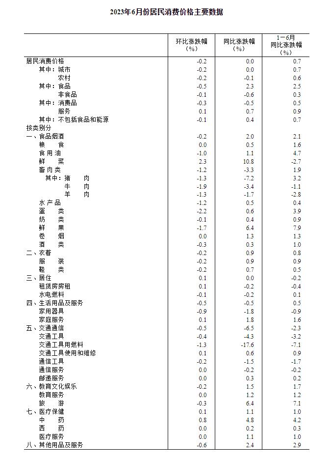 2023年6月份,全國(guó)居民消費(fèi)價(jià)格同比持平。其中,城市持平,農(nóng)村下降0.1%;食品價(jià)格上漲2.3%,非食品價(jià)格下降0.6%;消費(fèi)品價(jià)格下降0.5%,服務(wù)價(jià)格上漲0.7%。1--—6月平均,全國(guó)居民消費(fèi)價(jià)格比上年同期上漲0.7%。