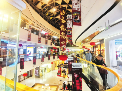 晚上6時(shí)30分,走進(jìn)省城龍湖萬達(dá)廣場(chǎng),遠(yuǎn)遠(yuǎn)的,霓虹燈閃爍,商場(chǎng)內(nèi)的喜慶裝飾讓人眼花繚亂,“龍運(yùn)當(dāng)頭”“龍年大吉”“金龍賀歲”等祝福語隨處可見,各個(gè)商家門頭上設(shè)置的龍年掛飾為節(jié)日氛圍增色添彩,很多商品無論外形還是包裝,都巧妙地融入了龍年的獨(dú)特元素,市民們踏著歡快的新春背景音樂,挑選著年貨賀禮。