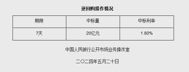 中新網5月20日電 據(jù)中國人民銀行網站消息,為維護銀行體系流動性合理充裕,2024年5月20日人民銀行以利率招標方式開展了20億元逆回購操作。具體情況如下: