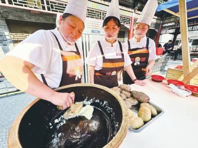 9月3日傍晚,太原鐘樓街,來自嵐縣的廚師正在制作當(dāng)?shù)靥厣朗惩炼埂澳酶狻薄=眨S著“跟著悟空游山西”的持續(xù)升溫,太原鐘樓街吸引了眾多游客,品嘗富有山西特色的美食成為人們打卡鐘樓街的主要內(nèi)容。