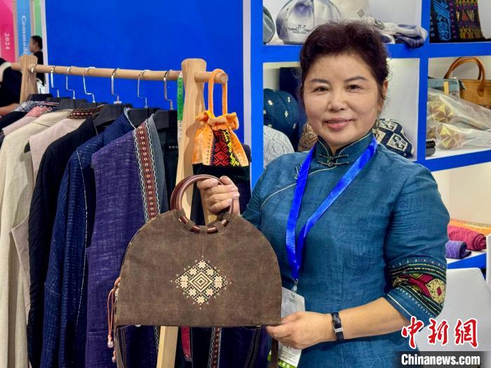 10月13日,來自海南的琴韻幽蘭品牌設(shè)計(jì)師王彬妮展示黎錦元素面料制成的產(chǎn)品。董易鑫 攝