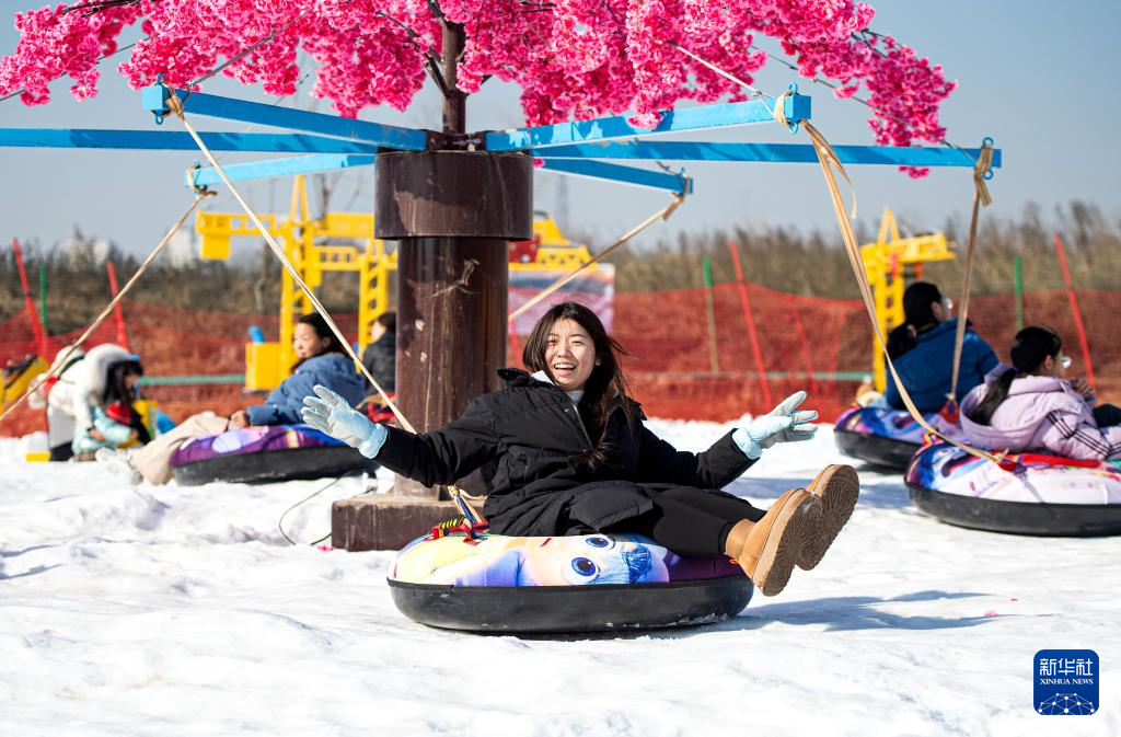 1月19日,在邯鄲市復(fù)興區(qū)東高河村滑雪場,游客在體驗滑雪圈項目。