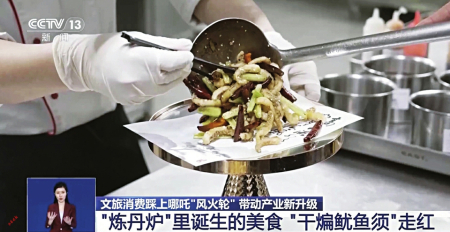 在天津一家酒店的餐廳里,記者看到一份新鮮出爐的“哪吒”菜譜:“太乙手撕雞”“混天綾拌海草”……在這當(dāng)中,最受食客歡迎的是天津特色菜“干煸魷魚(yú)須”,許多游客看到菜單,就會(huì)想到說(shuō)天津話的章魚(yú)將軍被天元鼎烤熟的場(chǎng)景。