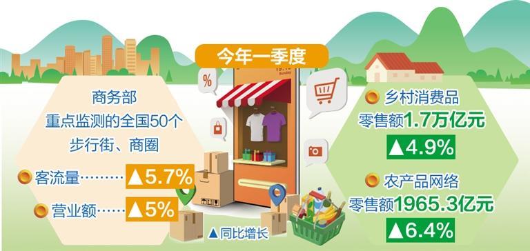 城市商業(yè)增速穩(wěn)定,一季度商務(wù)部重點監(jiān)測的全國50個步行街、商圈客流量、營業(yè)額同比分別增長5.7%、5%。縣域消費市場持續(xù)升溫,鄉(xiāng)村消費品零售額1.7萬億元,同比增長4.9%,增速高于城鎮(zhèn)0.4個百分點。農(nóng)村電商蓬勃發(fā)展,全國農(nóng)村網(wǎng)絡(luò)零售額6697.5億元,同比增長5.1%;農(nóng)產(chǎn)品網(wǎng)絡(luò)零售額1965.3億元,同比增長6.4%。