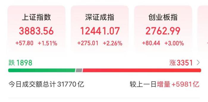 截至收盤,滬指漲1.51%報(bào)3883.56點(diǎn),深成指漲2.26%報(bào)12441.07點(diǎn),創(chuàng)業(yè)板指漲3%報(bào)2762.99點(diǎn)。滬深京三市全天成交額31770億元,較前一交易日大幅放量。