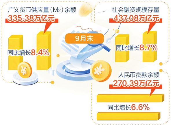 9月末,M2余額335.38萬億元,同比增長8.4%,在上年同期高基數(shù)背景下,仍保持較高增速;社會融資規(guī)模存量437.08萬億元,同比增長8.7%,比上年同期高0.7個(gè)百分點(diǎn);前三季度,社會融資規(guī)模增量累計(jì)為30.09萬億元,同比多增4.42萬億元。