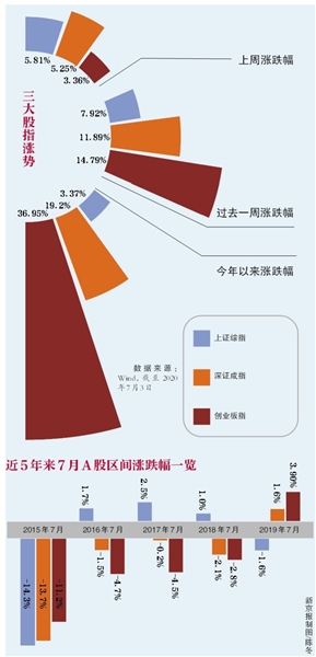 新京報記者統(tǒng)計(jì)了2010年7月-2019年7月間的數(shù)據(jù)發(fā)現(xiàn),事實(shí)上,指數(shù)在過去的10年中上漲與下跌的各約占半數(shù)。其中,滬指方面,近10年里,滬指6次在7月出現(xiàn)上漲,4次出現(xiàn)下跌。2010年7月為近10年的7月里上漲幅度最高的一年,漲幅為9.97%;2015年7月,滬指大幅下跌14.34%,是十年中7月跌幅最高的一年。