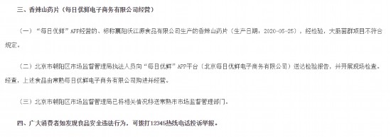 《通告》指出,北京市朝陽區(qū)市場監(jiān)督管理局執(zhí)法人員向“每日優(yōu)鮮”APP平臺(北京每日優(yōu)鮮電子商務(wù)有限公司)送達檢驗報告,并開展現(xiàn)場檢查。經(jīng)查,上述食品由常熟每日優(yōu)鮮電子商務(wù)有限公司購進并經(jīng)營。北京市朝陽區(qū)市場監(jiān)督管理局已將相關(guān)情況移送常熟市市場監(jiān)督管理部門。