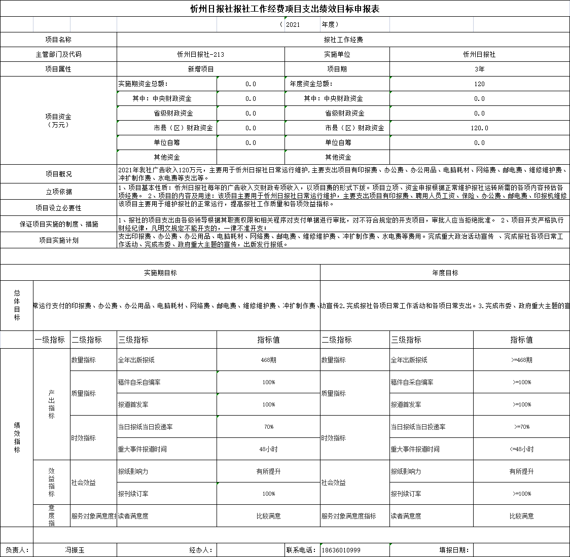 1、項(xiàng)目基本性質(zhì):忻州日?qǐng)?bào)社每年的廣告收入交財(cái)政專項(xiàng)收入,以項(xiàng)目費(fèi)的形式下?lián)埽?021年以忻州日?qǐng)?bào)社工作經(jīng)費(fèi)下?lián)芙o我單位120萬(wàn)元。項(xiàng)目立項(xiàng)、資金申報(bào)根據(jù)正常維護(hù)報(bào)社運(yùn)轉(zhuǎn)所需的各項(xiàng)內(nèi)容預(yù)估各項(xiàng)經(jīng)費(fèi)。