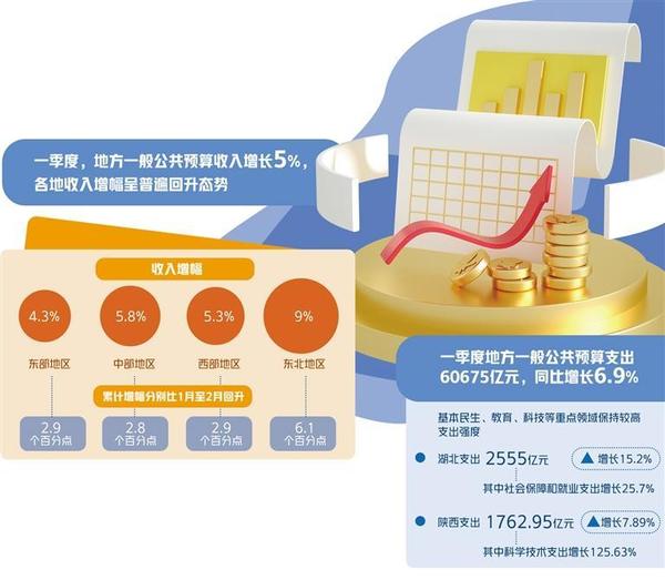 一季度,地方一般公共預(yù)算支出60675億元,同比增長6.9%。各地普遍在基本民生、教育、科技等重點(diǎn)領(lǐng)域保持較高支出強(qiáng)度。比如,湖北一季度地方一般公共預(yù)算支出2555億元,增長15.2%,其中社會保障和就業(yè)支出增長25.7%。陜西一季度一般公共預(yù)算支出1762.95億元,增長7.89%,其中科學(xué)技術(shù)支出增長125.63%?!案鞯刎?cái)政支出繼續(xù)保持較快增長,衛(wèi)生、社保、科技和農(nóng)林水支出增速加快,財(cái)政公共服務(wù)和保障能力不斷增強(qiáng)?!奔质∝?cái)政科學(xué)研究所所長張依群表示。