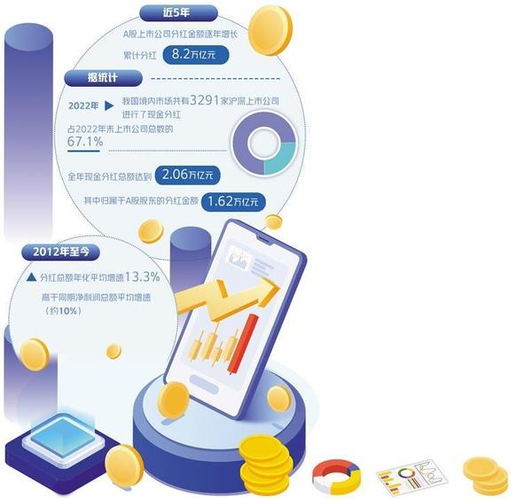 近5年,A股上市公司分紅金額逐年增長(zhǎng),累計(jì)分紅8.2萬(wàn)億元。據(jù)統(tǒng)計(jì),2022年,我國(guó)境內(nèi)市場(chǎng)共有3291家滬深上市公司進(jìn)行了現(xiàn)金分紅,占2022年末上市公司總數(shù)的67.1%,全年現(xiàn)金分紅總額達(dá)到2.06萬(wàn)億元,其中歸屬于A(yíng)股股東的分紅金額1.62萬(wàn)億元。國(guó)際比較來(lái)看,境內(nèi)市場(chǎng)分紅上市公司數(shù)量在全球主要證券市場(chǎng)中位居第一,現(xiàn)金分紅總額位列全球第二,分紅家數(shù)占比位列全球第二。此外,有163家上市公司公布2023年半年報(bào)現(xiàn)金分紅預(yù)案,預(yù)計(jì)分紅2030.1億元。