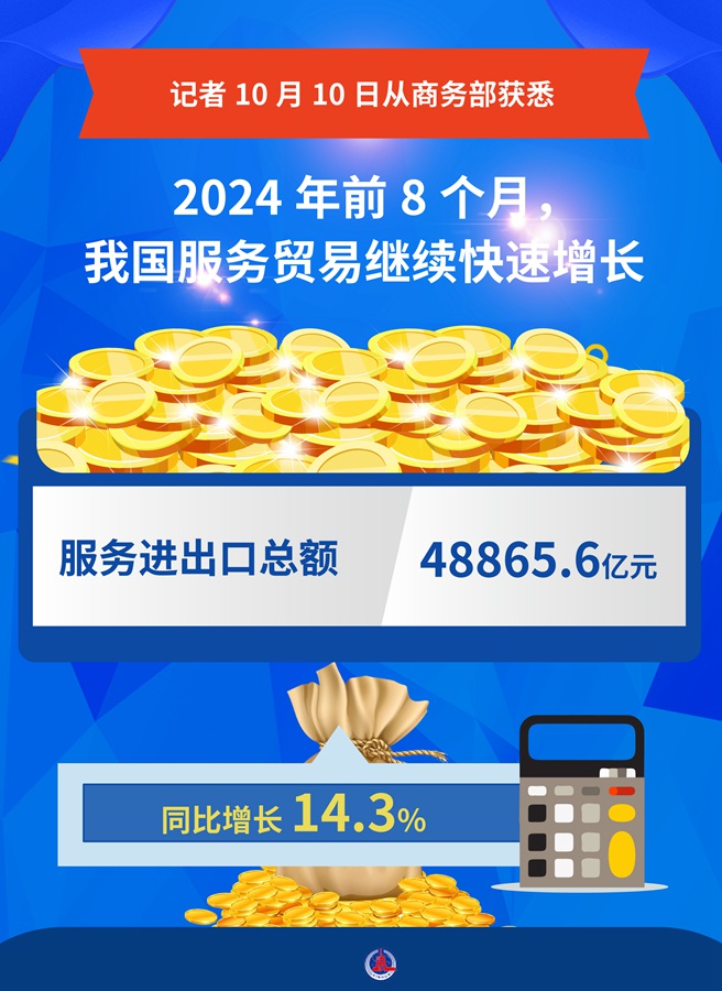 新華社北京10月10日電(記者謝?,帲┯浾?0日從商務(wù)部獲悉,今年前8個(gè)月,我國服務(wù)貿(mào)易繼續(xù)快速增長(zhǎng),服務(wù)進(jìn)出口總額48865.6億元,同比增長(zhǎng)14.3%。