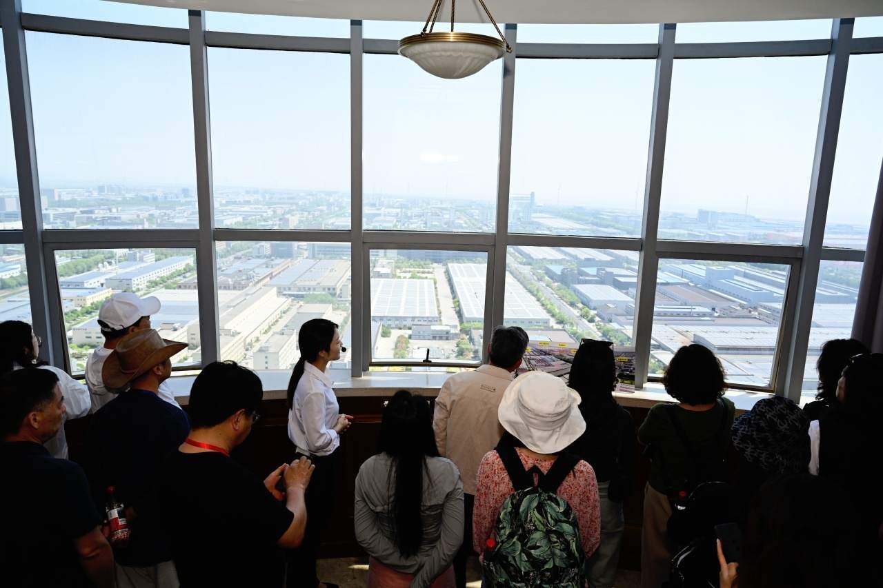 通過城市綠色觀景臺,采訪團成員們得以在空中觀景平臺俯瞰尖山全景,光伏發(fā)電板在陽光的照耀下熠熠生輝;不遠處,風力發(fā)電機的巨大葉片也在悠悠轉(zhuǎn)動。這一光伏發(fā)電與風力發(fā)電協(xié)同運作的景象被毫無保留地盡收眼底。
