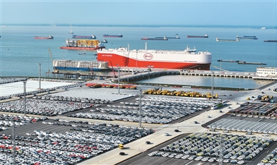 4月27日,搭載7000余輛比亞迪新能源商品車的汽車運(yùn)輸船比亞迪“深圳”號首航駛往巴西,創(chuàng)下國內(nèi)汽車單次出口量一個(gè)批次最多的紀(jì)錄。圖為運(yùn)輸船正在江蘇省蘇州港太倉港區(qū)裝載汽車。計(jì)海新攝(人民視覺)