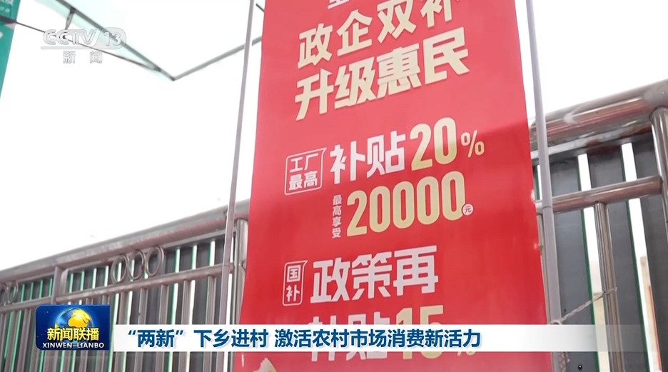 央視網(wǎng)消息(新聞聯(lián)播):“兩新”政策實(shí)施以來,各地通過擴(kuò)大補(bǔ)貼范圍、優(yōu)化服務(wù)等措施,將實(shí)惠和便利送到鄉(xiāng)村,激發(fā)農(nóng)村市場(chǎng)消費(fèi)活力。