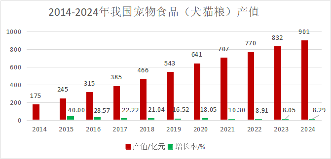 中國(guó)農(nóng)業(yè)科學(xué)院飼料研究所寵物營(yíng)養(yǎng)團(tuán)隊(duì)數(shù)據(jù)統(tǒng)計(jì)顯示,2024年我國(guó)寵物犬貓飼養(yǎng)量達(dá)1.4億只,寵物產(chǎn)業(yè)總規(guī)模突破3000億元,其中寵物食品市場(chǎng)占比最高。到2024年,寵物食品犬貓糧市場(chǎng)規(guī)模達(dá)到900億元,比2023年增長(zhǎng)8.3%。