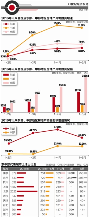 21世紀(jì)經(jīng)濟(jì)研究院比照數(shù)據(jù)發(fā)現(xiàn),僅開發(fā)投資數(shù)據(jù)的月度波動(dòng)并不足見房地產(chǎn)市場(chǎng)的冷熱狀況,因?yàn)檫@受不同地區(qū)的供地節(jié)奏影響較大。比如在5月,一些中部熱點(diǎn)城市的土地供應(yīng)明顯減少,造成了投資失速的狀況。