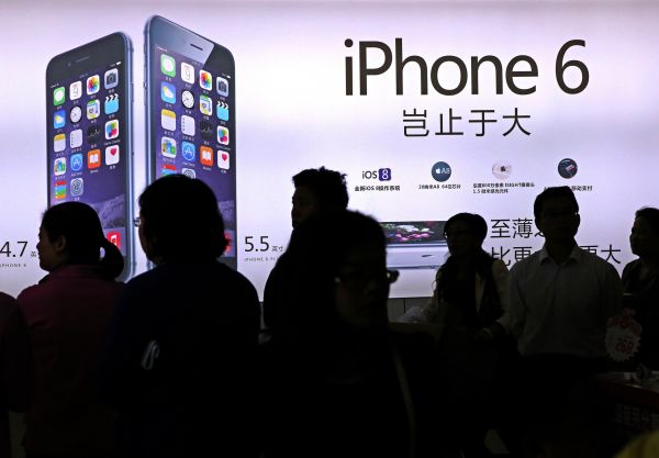 2014年10月17日,顧客在江西南昌的一家蘋果授權(quán)經(jīng)銷店門口排隊,等待購買iPhone6和iPhone6 Plus手機(jī)。 (新華社發(fā))