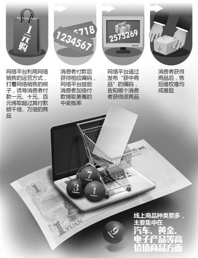 網(wǎng)站將商品價格平分成若干等份,一元一份,消費者購買一份或多份后,等待“幸運號碼”揭曉
