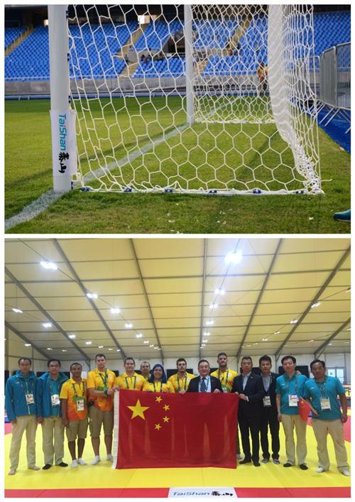(圖為里約奧運會上泰山體育提供的足球比賽設(shè)施和摔跤墊,泰山體育提供) 山東泰山體育產(chǎn)業(yè)集團為里約奧運會和殘奧會的田徑、自行車、摔跤、柔道、跆拳道、足球、鐵人三項等11項比賽提供了近萬件賽事用品。其中,泰山體育為中國國家山地自行車隊提供了比賽專用車,這是中國自行車民族品牌首次登上夏季奧運會賽場。
