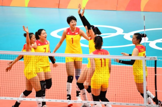 (圖為里約奧運會女排小組賽中,中國隊球員在與波多黎各隊比賽中慶祝得分。新華社圖片) 江蘇金陵體育器材公司成為里約奧運會排球比賽器材供應(yīng)商,其生產(chǎn)的排球網(wǎng)柱、裁判椅等器材也出現(xiàn)在里約奧運會賽場上。