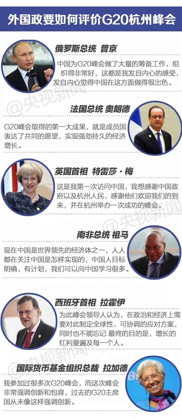 各方高度贊揚(yáng)杭州峰會的共識,感謝中國舉辦會議的付出。一些與會領(lǐng)導(dǎo)人還肯定了中國的發(fā)展成就以及中國經(jīng)濟(jì)發(fā)展對全球經(jīng)濟(jì)的影響,明確表示愿與中國加強(qiáng)合作的意愿。杭州峰會使G20進(jìn)入升級版,使中國成為G20中舉足輕重的角色。