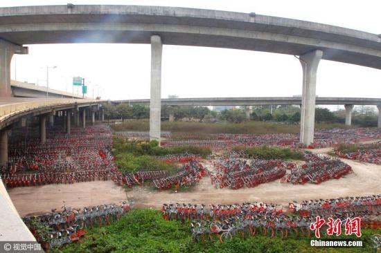 資料圖片,廣州海珠區(qū)新洲立交橋下擺滿了共享單車。 馬強 攝 圖片來源:視覺中國