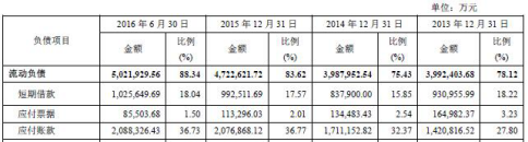 根據(jù)招股書,2013年至2016年6月,重慶建工負(fù)債合計5,110,662.36萬元、5,286,972.23萬元、5,647,761.37萬元、5,685,083.35萬元。其中,流動負(fù)債為3,992,403.68萬元、3,987,952.54萬元、4,722,621.72萬元、5,021,929.56萬元,占負(fù)債總額的78.12%、75.43%、83.62%、88.34%;非流動負(fù)債1,118,258.68萬元、1,299,019.6萬元、925,139.64萬元、663,153.80萬元,占負(fù)債總額的21.88%、24.57%、16.38%、11.66%。
