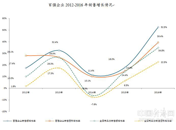 2016年百強(qiáng)企業(yè)憑借準(zhǔn)確的市場研判、契合主流的市場布局與產(chǎn)品架構(gòu),實(shí)現(xiàn)新一輪的跨越式發(fā)展,銷售規(guī)模加速提升,市場份額突破四成。銷售總額、銷售面積分別達(dá)48027.1億元、40251.7萬平方米,同比增長52.5%和39.4%。受益于規(guī)模和品牌效應(yīng)的持續(xù)擴(kuò)大,百強(qiáng)企業(yè)銷售額和銷售面積增長率分別高于同期全國增幅17.7、16.9個(gè)百分點(diǎn),行業(yè)領(lǐng)先優(yōu)勢進(jìn)一步彰顯。