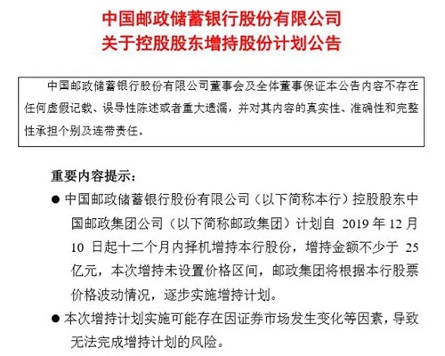 備受市場關(guān)注的是,同日,郵儲(chǔ)銀行還發(fā)布了《關(guān)于控股股東增持股份計(jì)劃公告》。公告稱,控股股東中國郵政集團(tuán)公司(下稱郵政集團(tuán))計(jì)劃自2019年12月10日起12個(gè)月內(nèi)擇機(jī)增持該行A股股份,增持金額不少于25億元。這體現(xiàn)了控股股東對(duì)郵儲(chǔ)銀行投資價(jià)值的高度認(rèn)可,也將為證券市場的穩(wěn)定運(yùn)行創(chuàng)造良好環(huán)境,彰顯“國家隊(duì)”擔(dān)當(dāng)。