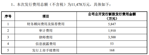 本次發(fā)行費用(不含稅)共計1.15億元,其中中信證券、招商證券作為保薦機構(gòu)獲得保薦、承銷費用5847萬元。