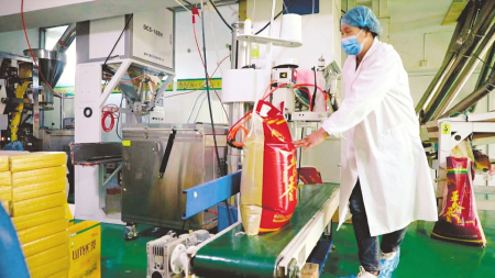 位于蔡家會(huì)鎮(zhèn)的興縣山花爛漫農(nóng)業(yè)綜合開發(fā)有限公司,日精加工50噸谷子成套設(shè)備生產(chǎn)流水線上,經(jīng)過初篩、精選、加工、包裝后的袋裝小米經(jīng)過傳輸帶被送往庫(kù)房,等待裝車發(fā)貨?!拔覀兊漠a(chǎn)品涵蓋有機(jī)小米、綠豆、莜面、豇豆面、亞麻籽油等,年加工雜糧、油料可達(dá)4萬多噸?!惫径麻L(zhǎng)賀虎平介紹,自2005年“山花爛漫”商標(biāo)注冊(cè)以來,已與興縣50多個(gè)自然村,916戶農(nóng)戶,簽訂訂單農(nóng)業(yè)近3萬畝,其中脫貧戶430多戶,戶均收入達(dá)到1.5萬余元/年。