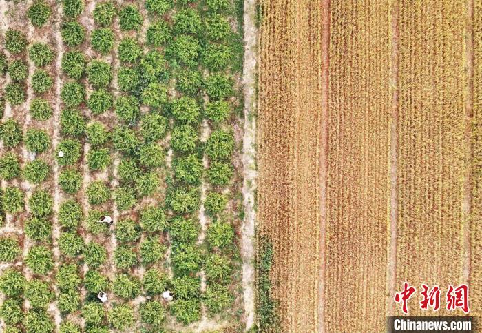 山西省運城市新絳縣澤掌鎮(zhèn)喬溝頭村,幾名花農(nóng)在田間采摘金銀花。(無人機照片)高新生 攝