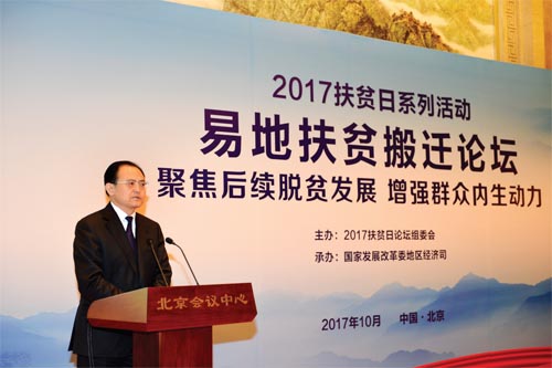 本次論壇以“聚焦后續(xù)脫貧發(fā)展,增強群眾內(nèi)生動力”為主題,是2017 年扶貧日系列活動之一。來自國家發(fā)改委、人力資源社會保障部、國土資源部、交通運輸部、水利部、農(nóng)業(yè)部、商務(wù)部、中國人民銀行、國家林業(yè)局、國家旅游局、銀監(jiān)會、國務(wù)院扶貧辦、全國工商聯(lián)、國家開發(fā)銀行、中國農(nóng)業(yè)發(fā)展銀行等部門和單位有關(guān)司局負責同志,全國22 個有易地扶貧搬遷任務(wù)的省份發(fā)展改革委負責同志以及部分省、市、縣從事易地扶貧搬遷工作的干部群眾,帶動搬遷群眾脫貧致富的部分龍頭企業(yè)代表,共約100 人參加了論壇。
