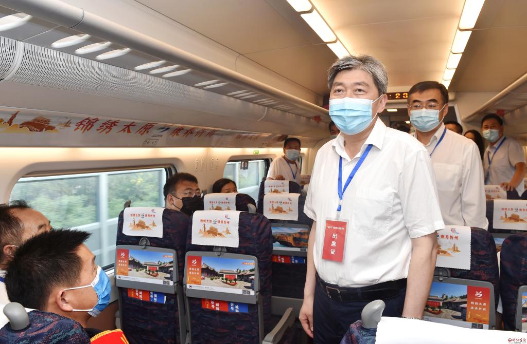 儀式結束后,朱曉東、李建國等一行共同乘坐以“錦繡太原·康養(yǎng)忻州”為主題包裝打造、冠名“太忻號”的D5306次動車組列車返回忻州。
