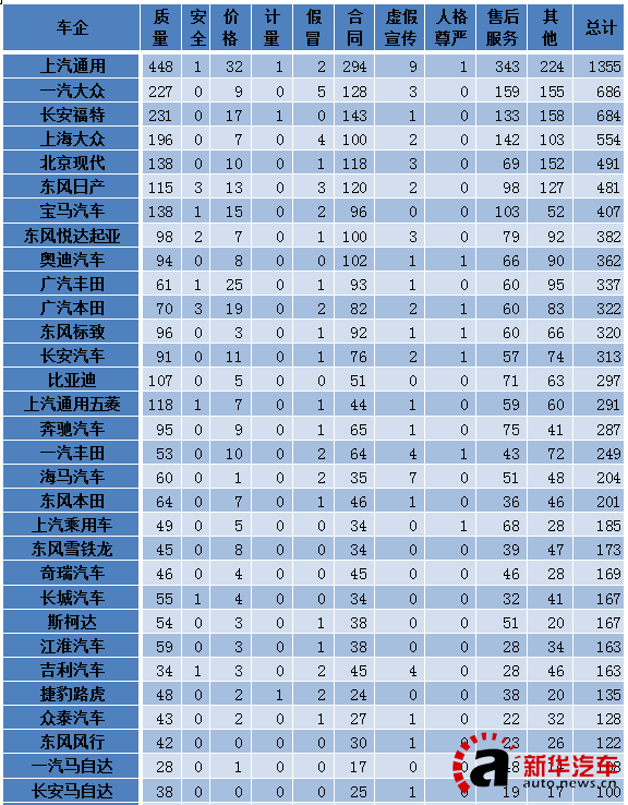 中消協(xié)2015汽車(chē)廠家被投訴具體數(shù)據(jù)排行榜(部分)