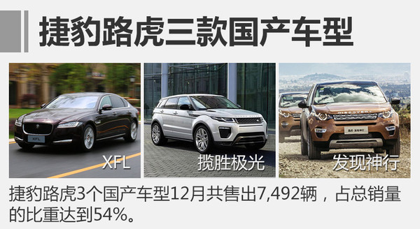 捷豹路虎去年能夠超越自我,實現(xiàn)新的銷量記錄,國產車型成為最重要因素。剛剛結束的2016年12月,捷豹路虎在華共售出13,859輛,與2015年同期(10,227輛)相比大漲36%。其中,捷豹路虎在華合資公司生產的3款國產車型捷豹XFL、路虎極光、發(fā)現(xiàn)神行,12月共售出7,492輛,占總銷量的比重達到54%。