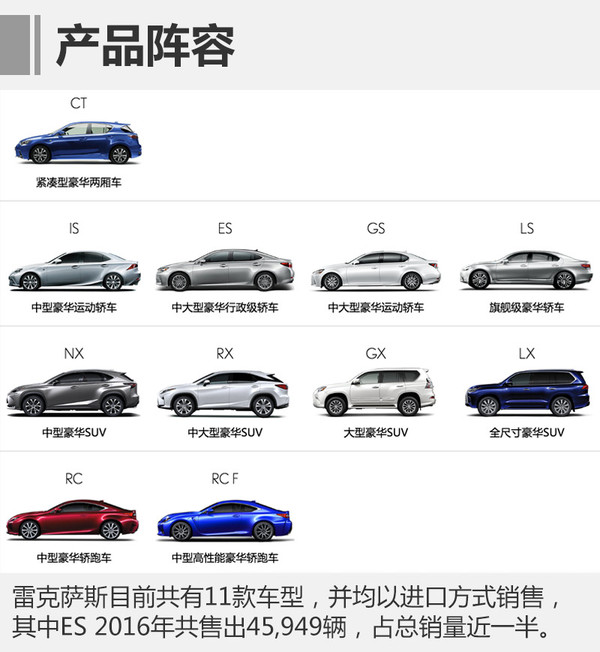 從產品上看,雷克薩斯主要銷量集中在ES、NX、RX這三款車型。其中作為“最暢銷車型”,ES 2016年全年共售出45,949輛,貢獻了近一半的銷量。