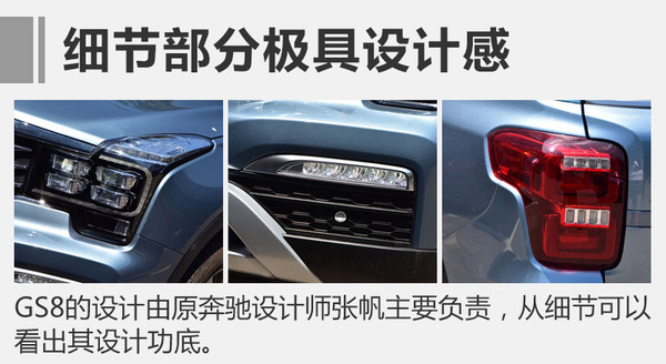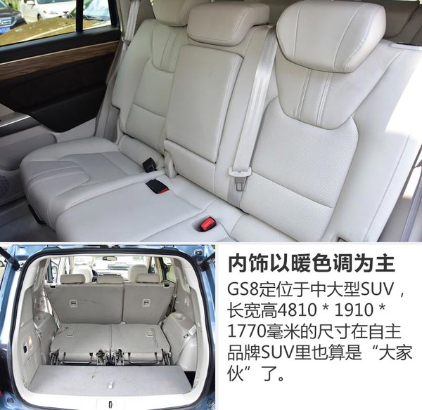 GS8的設計由原奔馳設計師張帆操刀,在內(nèi)飾部分也較為洞察國內(nèi)消費者的喜好。車內(nèi)整體寬敞舒適,顏色采用偏暖的木色,打造一種家用溫馨感??臻g方面,GS8的長寬高分別為4810*1910*1770毫米,軸距2800毫米,采用7座布局。