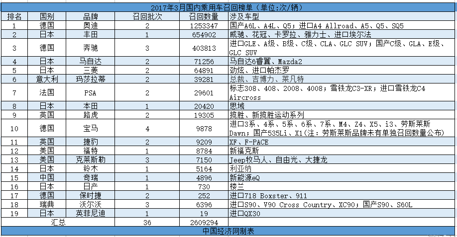 根據(jù)國(guó)家質(zhì)檢總局缺陷產(chǎn)品管理中心3月份發(fā)布的召回公告,中國(guó)經(jīng)濟(jì)網(wǎng)汽車(chē)頻道經(jīng)過(guò)匯總、統(tǒng)計(jì),整理出“3月國(guó)內(nèi)乘用車(chē)召回榜單”。3月份,中國(guó)汽車(chē)市場(chǎng)內(nèi)共有21個(gè)汽車(chē)品牌發(fā)布了累計(jì)36次召回公告,共計(jì)召回2609294輛汽車(chē)。