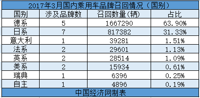 從國(guó)別情況來(lái)看,3月,德系共5個(gè)品牌召回車(chē)輛1667290輛,占召回總量的63.9%;日系共7個(gè)品牌召回汽車(chē)817382輛,占比31.33%;法系、英系和美系各有2個(gè)品牌發(fā)布召回召回公布,分別召回汽車(chē)29601輛、28514輛、15934輛,占比分別為1.13%、1.09%、0.61%;其余,意大利、瑞典以及自主各有一個(gè)品牌發(fā)布召回公告,合計(jì)占召回總量的1.95%。