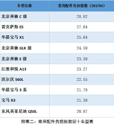 常用配件負(fù)擔(dān)指數(shù)方面,在汽車零整比系數(shù)基礎(chǔ)上,挖掘事故車維修數(shù)據(jù),選取配件損失率大于 1%的常用配件進(jìn)行研究,導(dǎo)入計(jì)算公式核算各車型的常用配件負(fù)擔(dān)指數(shù)。在樣本車型中最高的車型為北京奔馳 C級(jí),常用配件負(fù)擔(dān)指數(shù)為 28.82;最低的車型為哈弗 H6,常用配件負(fù)擔(dān)指數(shù)為 9.32。