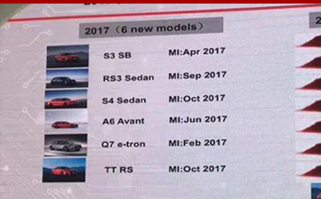 從曝光的產(chǎn)品規(guī)劃來(lái)看,2017年奧迪有6款新車(chē)上市。到目前為止,奧迪Q7 e-tron和A6 Avant已經(jīng)按照規(guī)劃正式上市。原本計(jì)劃在4月上市的S3 Sportback有望三季度正式投入市場(chǎng),奧迪RS 3 Sedan在9月上市,而奧迪S4 Sedan與TT RS將于今年10月上市。
