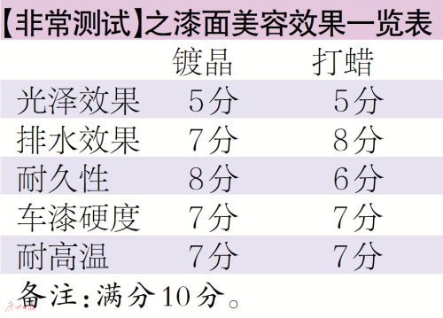 車天下君在兩塊車身試驗面板上進行測試,一塊鍍晶,一塊打蠟。全部按照說明書手工操作。車天下君是個理工男,做這些事情還算是輕車熟路。完工對比光澤效果,在都沒有拋光處理的情況下,鍍晶和打蠟都沒有起到提升漆面光澤的效果,給予“不及格”的差評。潑上水,漆面都形成水珠,但仔細(xì)比較,會發(fā)現(xiàn)打蠟的排水效果比鍍晶要好。